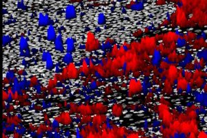 The AstroPath platform allows for the assessment of the level of expression of a given marker on individual cells, while maintaining information on their spatial location. Shown here is a melanoma tissue section. PD-L1 expression is shown in red and PD-1 in blue. The height of the peaks represent the levels of expression. (Courtesy of Seyoun Park, Ph.D.)