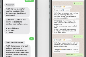 The mobile training is done through conversational text messaging, with information based on guidelines established by the World Health Organization and the Centers for Disease Control. As guidelines change, so does the training; information about the use of masks was added “almost overnight,” Teran says.