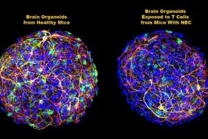 The researchers then sought to better define how the accumulating CD4+ T cells were destroying white matter — actually a fat called myelin that covers and protects neurons in the brain, and facilitates communication between them. To do this, they used organoids, mouse brain cells grown in the laboratory to simulate the entire brain. Brain-derived CD4+ T cells from mice with NEC were added to these laboratory “mini-brains” and then examined for several weeks.