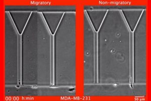In a bid to develop a test of metastatic potential that would fill in some of these gaps and be used in conjunction with current technologies, the investigators took advantage of a somewhat serendipitous finding, says Konstantopoulos. While he and his colleagues were studying the movement of nonmetastatic breast cancer cells through engineered environments consisting of Y-shaped channels of varying dimensions, they observed that these cells couldn’t enter the narrower sections of the device. “The ability to move and deform in order to enter narrow spaces is required by the metastatic tumor cells to be able to move from the primary tumor to a distant site within the patient’s body, while uncontrolled growth is also needed for the cells to colonize distant tissues.”